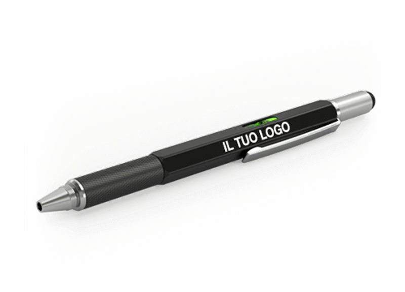 La penna multifunzione Star combina 5 strumenti pratici in un unico modello elegante, tra cui un pennino touch stilo, un cacciavite, un righello, un livella a bolla ed una penna a sfera. Il modello Star dispone anche di due ampie aree di stampa che possiamo personalizzare con il tuo logo, lo slogan, l'indirizzo del sito web ed altro ancora. Utile e leggero, il modello Star è estremamente utilizzato per Eventi e Conferenze.